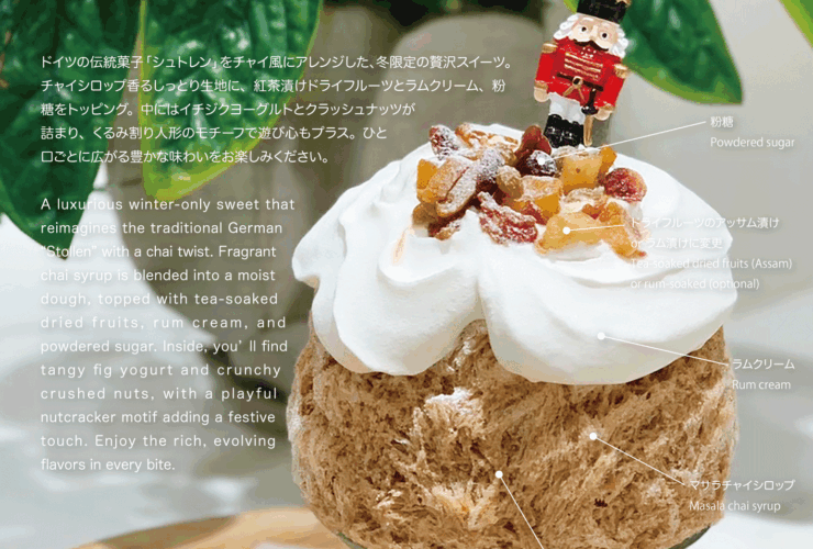 食感、味わい共に繊細なマスカット・ジパングを生かす為に極力シンプルに仕上げ、ゴールデンアールグレイで味わいを引き出しています。
